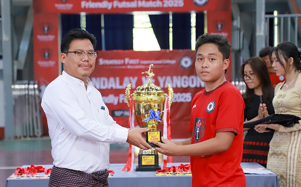 Strategy First International College ရန်ကုန်နှင့် မန္တလေးကျောင်းများတွင် ဖွင့်လှစ်ထားသော UK ဘွဲ့ကြိုအတန်းများတွင် တက်ရောက်နေသည့် Strategy First Football Club မှ ကျောင်းသားများ ဦးဆောင်ပြီး ချစ်ကြည်ရေးဘောလုံးပြိုင်ပွဲနှင့် ဖူဆယ်ပြိုင်ပွဲများ ကျင်းပပြုလုပ် Strategy First International College Yangon Football Club မှ ကျောင်းသားများသည် မန္တလေးမြို့သို့လာရောက်ပြီး Strategy First International College Mandalay Football Club မှ ကျောင်းသားများနှင့်အတူ ချစ်ကြည်ရေးဘောလုံးပြိုင်ပွဲနှင့် ဖူဆယ်ပြိုင်ပွဲများကို ရင်းရင်းနှီးနှီး ပျော်ရွှင်စွာ အားကစားစိတ်ဓါတ်အပြည့်ဖြင့် ယှဉ်ပြိုင်ကစားခဲ့ကြပါသည်။ …………………………… ချစ်ကြည်ရေးဘောလုံးပြိုင်ပွဲကို နိုဝင်ဘာလ (၉) ရက်နေ့တွင် ရွှေမန်းတောင်ကွင်း၌ မန္တလေးအသင်းနှင့် ရန်ကုန်အသင်း အကြိတ်နယ် ယှဉ်ပြိုင်ကစားကြရာ ရန်ကုန်အသင်းမှ (၅) ဂိုး - (၁) ဂိုးဖြင့် အနိုင်ရရှိခဲ့ပါသည်။ ချစ်ကြည်ရေးဖူဆယ်ပြိုင်ပွဲတွင် YGN Team-A, YGN Team-B နှင့် MDY Team-A, MDY Team-B စသည်ဖြင့် အသင်း (၄) သင်းခွဲပြီး မန္တလာသီရိ ဘက်စုံသုံးအားကစားခန်းမကြီး၌ နိုဝင်ဘာလ (၉) ရက်နေ့တွင် ယှဉ်ပြိုင်ကစားခဲ့ကြပါသည်။ Strategy First Dance club ၏ Cheerleader ဖျော်ဖြေရေးအစီအစဥ်များလည်း ပါဝင်ခဲ့ပြီး Strategy First International College မှ ကျောင်းသား၊ ကျောင်းသူများမှ ချစ်ကြည်ရေးပွဲများသို့ လာရောက်ကြည့်ရှု အားပေးခဲ့ကြပါသည်။ အဆိုပါ ချစ်ကြည်ရေးဖူဆယ်ပြိုင်ပွဲတွင် Mandalay Team (B) မှ Champion ဆုကို ဆွတ်ခူးနိုင်ခဲ့ပြီး Yangon Team (B) မှ ဒုတိယဆုကိုလည်းကောင်း၊ YGN Team (A) မှ တတိယဆုကိုလည်းကောင်း၊ MDY Team (A) မှ နှစ်သိမ့်ဆုကိုလည်းကောင်း အသီးသီးရရှိခဲ့ကြပါသည်။ အသင်းအလိုက်ဂုဏ်ပြုဆုများနှင့် တစ်ဦးချင်းဆုတံဆိပ်များကို ပေးအပ်ချီးမြှင့်ခဲ့ရာတွင် 🏆 Champion - MDY Team (B) 🥇1st Runner Up - YGN Team (B) 🥈2nd Runner Up - YGN Team (A) 🏅Best Player - ကိုဇာနည်မင်းစံ (YGN Team – A) 🏅Best Keeper - ကိုစိုင်းဟက်ခေး (MDY Team – B) 🏅Top Scorer - ကိုအောင်စွမ်းပြည့် (MDY Team - B) တို့မှ ဆွတ်ခူးရရှိခဲ့ကြပါတယ်။ ယခုလို “Mandalay vs Yangon Friendly Football & Futsal Matches 2025” ပွဲဖြစ်မြောက်အောင် ဆောင်ရွက်ပေးခဲ့ကြသော Strategy First Football Club၊ ပါဝင်ကူညီအားဖြည့်ပေးခဲ့ကြသော Strategy First Dance Club နှင့် တစ်ခဲနက် လာရောက်အားပေးခဲ့ကြသော UK ဘွဲ့ကြိုအတန်းအသီးသီးမှ ကျောင်းသား၊ ကျောင်းသူများအားလုံးတို့ကို Strategy First International College မှ အထူးပင် ကျေးဇူးတင်ရှိပါသည်။