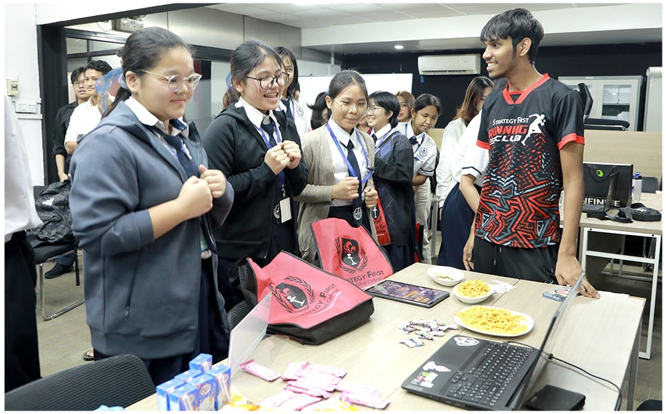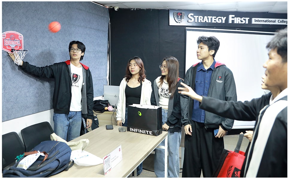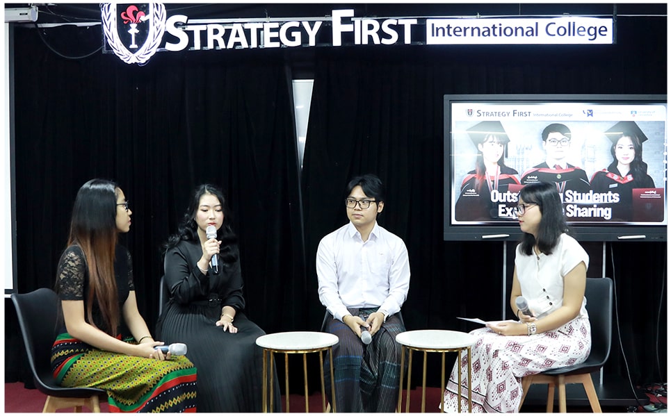 Grade-12/ GED/ GCE A Level/ Level 3 အောင်မြင်ပြီးနောက် ပြည်တွင်း၌ UK မှ ချီးမြှင့်မည့်ဘွဲ့များကို အချိန် (၃) နှစ်ဝန်းကျင်ဖြင့် ရယူနိုင်မည့် အခွင့်အလမ်းများနှင့် Oversea Experience ရယူချင်သူများအတွက် နောက်ဆုံးနှစ်ကို UK , Singapore အစရှိသည့် နိုင်ငံများတွင် ဆက်လက်တက်ရောက်နိုင်ရန် လိုအပ်သည်များ၊ Strategy First International College မှ နှစ်စဉ်ချီးမြှင့်သည့် ပညာသင်ဆုများ၊ အလုပ်အကိုင်အခွင့်အလမ်းများ စသည်တို့ကို Strategy First မှ တာဝန်ရှိသူများနှင့် တစ်ဦးချင်း အခမဲ့ဆွေးနွေးမေးမြန်းခြင်းများ လုပ်ဆောင်ခဲ့ကြပါသည်။ ထို့နောက် Strategy First ကျောင်းသားများကိုယ်တိုင်ဦးဆောင်နေသည့် Students Clubs and Societies များကိုလည်း ကြည့်ရှုလေ့လာခဲ့ကြပါသည်။