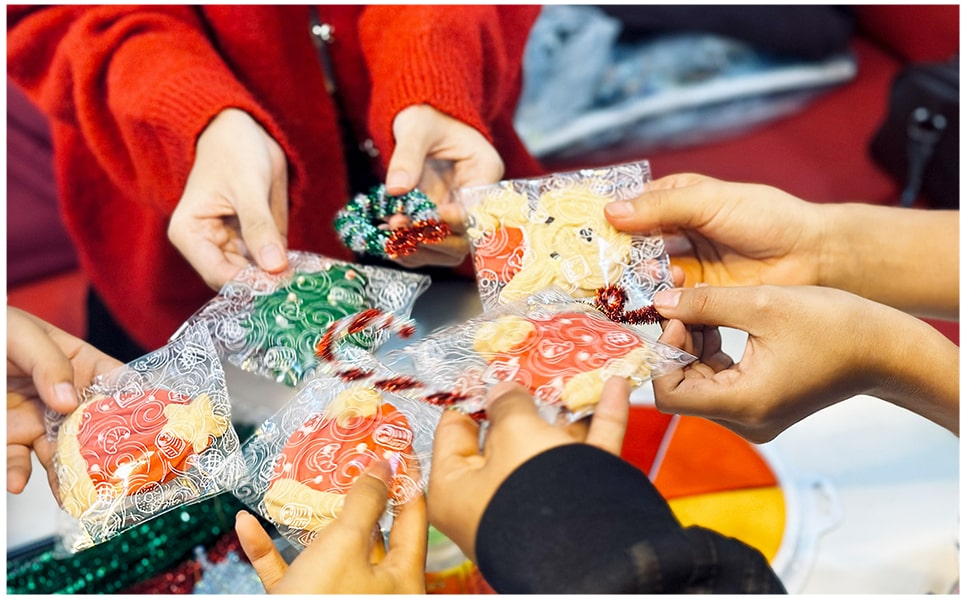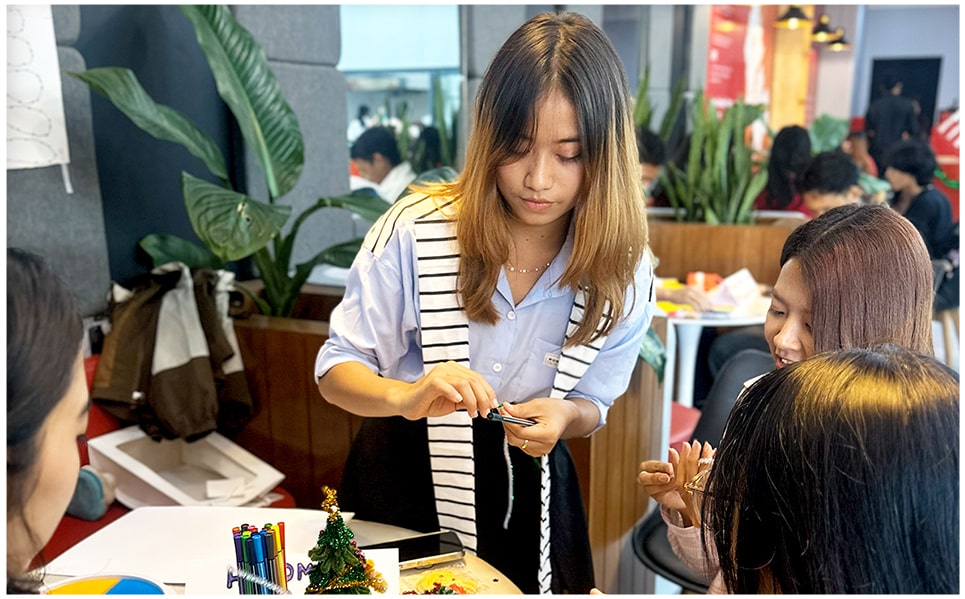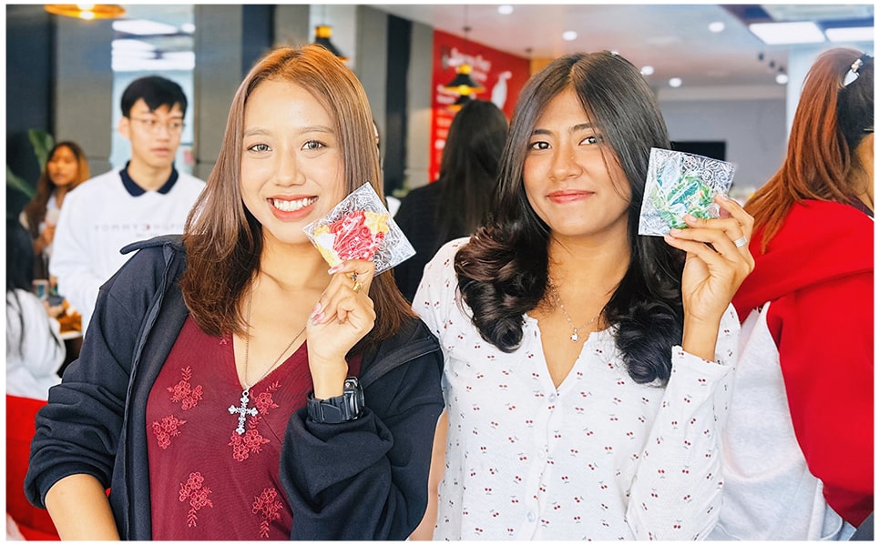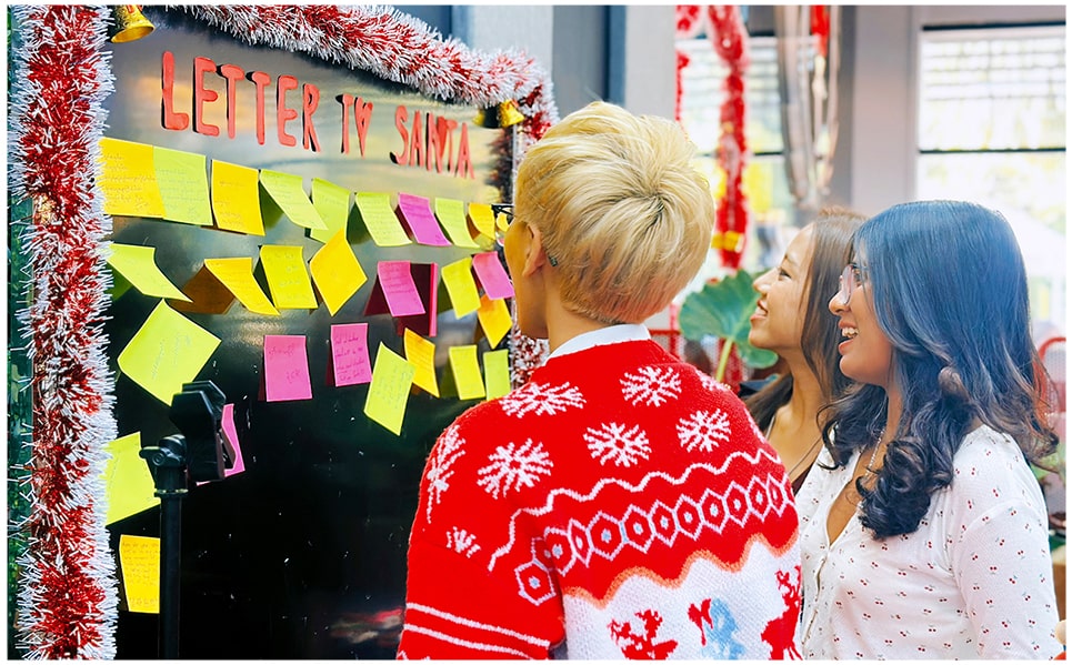 ပွဲသို့ တက်ရောက်လာသော ကျောင်းသား၊ ကျောင်းသူများကို နွေးထွေးစွာ ကြိုဆိုနှုတ်ဆက်ခဲ့ပြီးနောက် Cookie များဖြင့် ဧည့်ခံကာ Christmas သီချင်းများဖြင့် သီဆိုဖျော်ဖြေခဲ့ကြပါသည်။ ထို့နောက် Christmas အတွက် ဖန်တီးထားသော Backdrop တွင် Christmas Tree, Santa Hats & Beards စသည့် Props များဖြင့် အလှဓါတ်ပုံများ ရိုက်ကူးခဲ့ကြပြီး အရောင်ခြယ်ကတ်ပြုလုပ်ပုံများ သင်ယူကာ Christmas အတွက် အမှတ်တရ ဆုတောင်းမေတ္တာစကားများ နွေးထွေးသိုက်ဝန်းစွာ ရေးသားခဲ့ကြပါသည်။ ကျောင်းသားများအချင်းချင်း လက်ဆောင်လဲလှယ်ခြင်းအစီအစဉ်ကို ပျော်ရွှင်စွာ အတူတကွလုပ်ဆောင်ခဲ့ကြပြီးနောက် Christmas Blind Box (၃) ခုကို ကံစမ်းမဲဖောက်ကာ အခမ်းအနားပြီးမြောက်ခဲ့ပါသည်။
