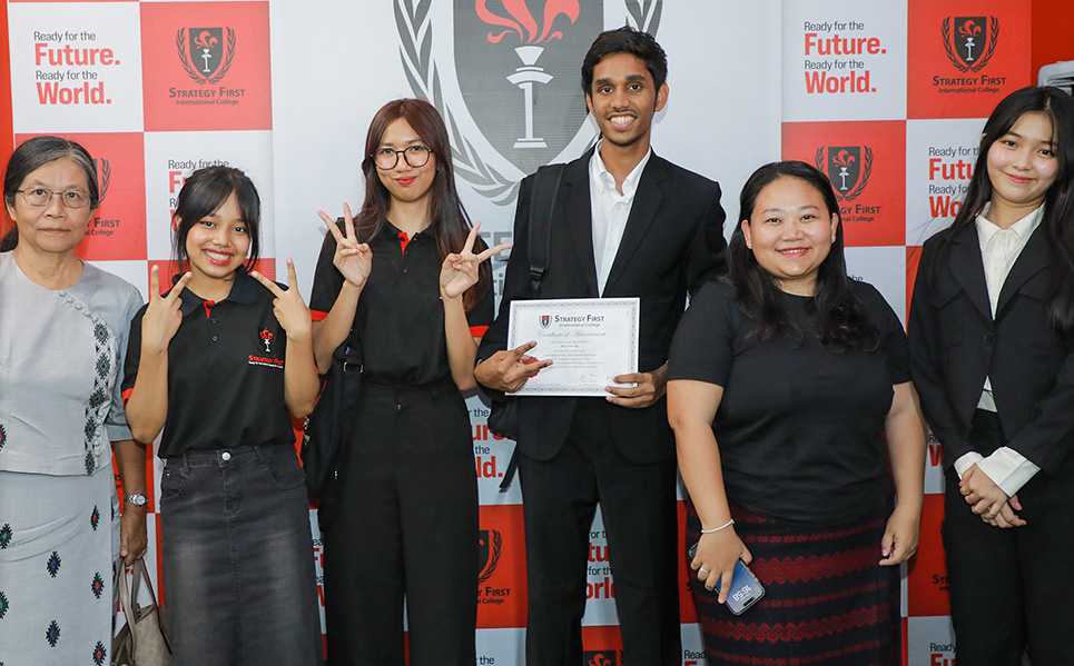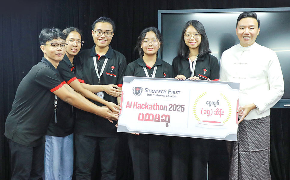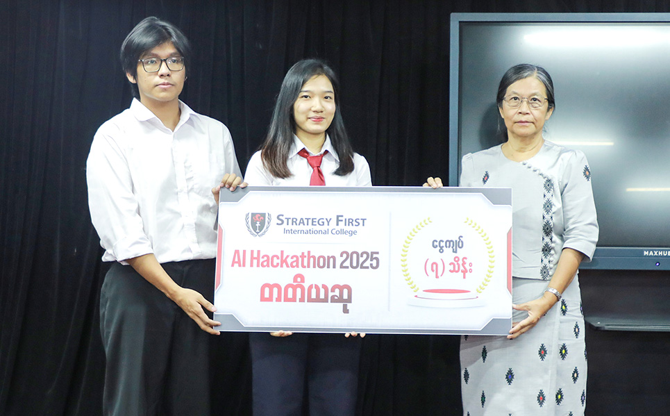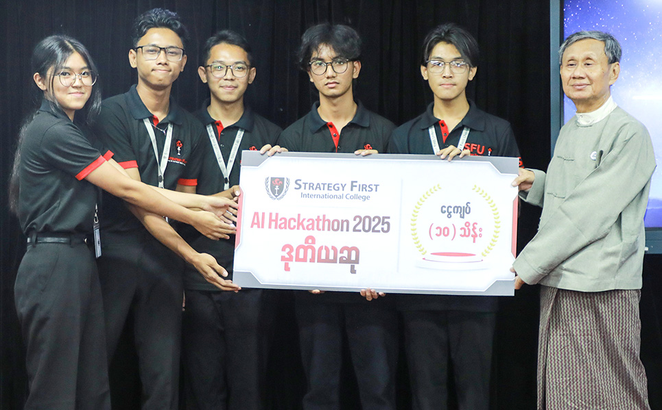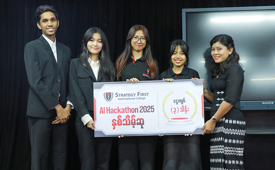 Strategy First ၌ Computing with Business Management နှင့် Computing, UK ဘွဲ့ကြိုအတန်းများ တက်ရောက်နေကြသည့် ကျောင်းသား၊ ကျောင်းသူများ၏ တီထွင်ဖန်တီးနိုင်စွမ်း၊ ပြဿနာဖြေရှင်းနိုင်စွမ်းနှင့် စီးပွားရေးဆိုင်ရာ အတွေးအခေါ်များကို လက်တွေ့အသုံးချနိုင်ရန် ကျင်းပပြုလုပ်ခဲ့သော “AI Hackathon” ဆုပေးပွဲအခမ်းအနား ပုံရိပ်များကို မျှဝေပေးလိုက်ပါသည်။