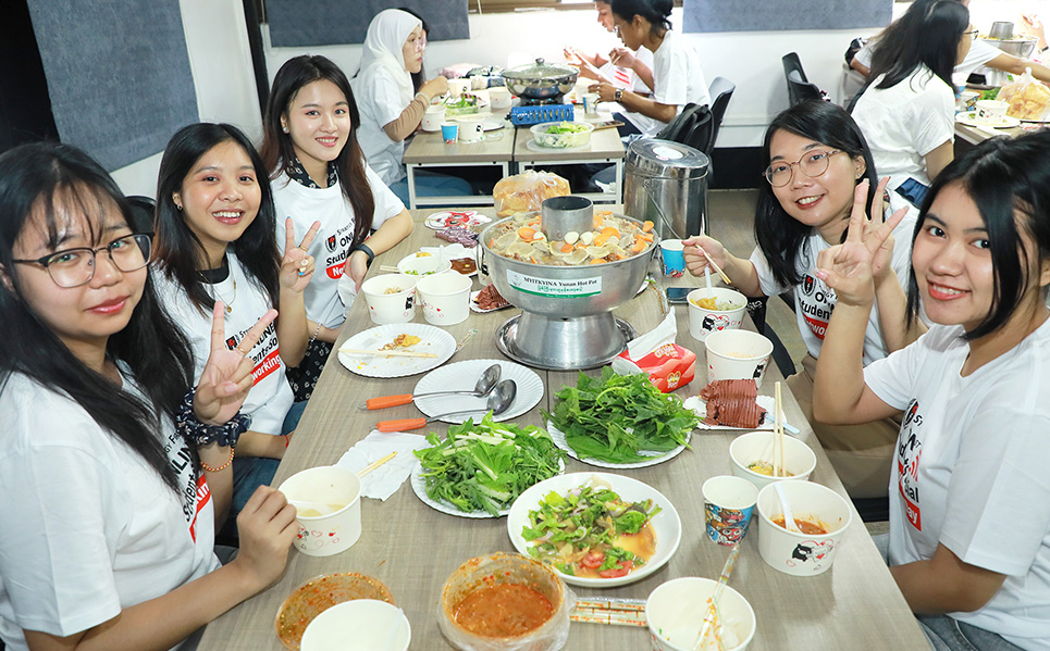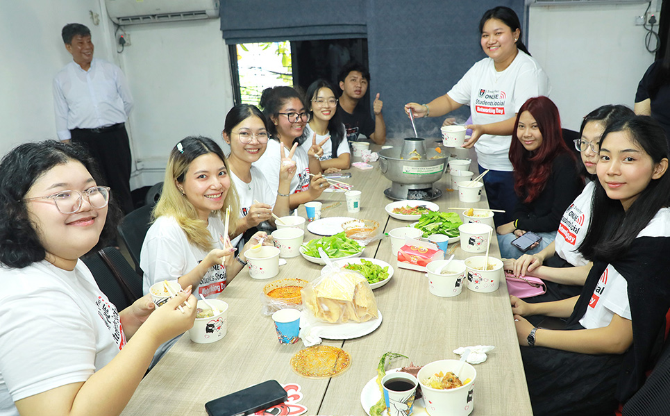 ထို့နောက် Potluck Party တွင် အဆာပြေမုန့်များဖြင့် ကျွေးမွေးဧည့်ခံခဲ့ပြီး ကျောင်းသား၊ ကျောင်းသူများ ပိုမိုရင်းနှီးစေရန် Team Building ဂိမ်းများ ဆော့ကစားခဲ့ကြကာ အမှတ်တရ ဓာတ်ပုံများ ရိုက်ကူးပေးခဲ့ပါသည်။
