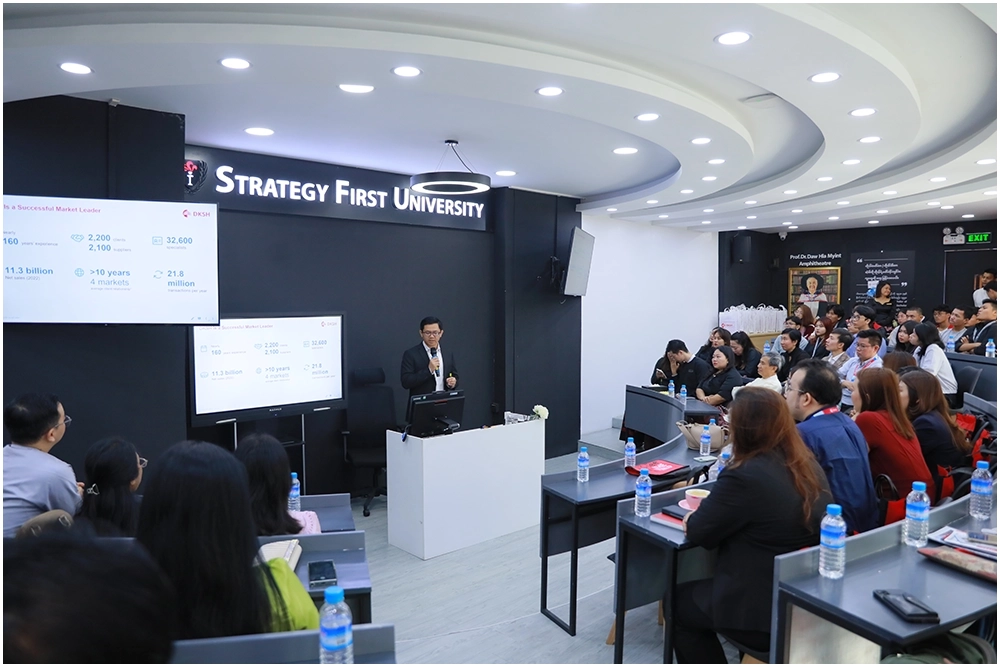 Strategy First International College နှင့် DKSH Myanmar တို့အကြား လူ့စွမ်းအားအရင်းအမြစ် ဖွံ့ဖြိုးတိုးတက်ရေး ပူးပေါင်းဆောင်ရွက်ရန်အတွက် နားလည်မှုစာချွန်လွှာ လက်မှတ်ရေးထိုးပွဲကို ဇန်နဝါရီလ (၃၀) ရက်နေ့က Strategy First Panchan Tower Teaching Centre မှာ ကျင်းပပြုလုပ်ခဲ့ပါတယ်။ အခမ်းအနားကို Strategy First International College မှ Founder/ President ဆရာဦးအောင်ချစ်ခင်၊ Academic Director ဆရာကြီး ပါမောက္ခ ဒေါက်တာ ဦးစိန်မင်း၊ Strategy First International College မှ Vice President (Administration) ဦးအောင်ကျော်ဌေး၊ Corporate Clients Manager ဦးဝေယံလင်းနဲ့ Strategy First Management အဖွဲ့ဝင်များ တက်ရောက်ခဲ့ကြပြီး DKSH Myanmar ဘက်မှလည်း Head of Country Management, Mr. Ankur Pandey ၊ Country HR Director, Mr. Navuth Yang နဲ့ DKSH Management အဖွဲ့ဝင်များ တက်ရောက်ခဲ့ကြပါတယ်။