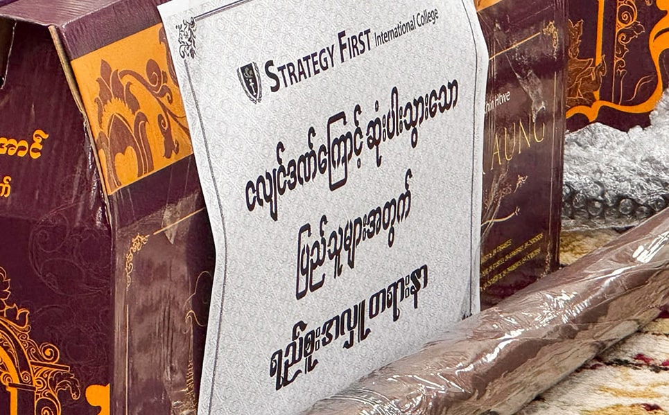 မတ်လ (၂၈) တွင် လှုတ်ခတ်သွားသော အင်အားပြင်းငလျင်ဒဏ်ကြောင့် ဆုံးပါးသွားသော ပြည်သူများနှင့် Strategy First မှ ကျောင်းသူများဖြစ်ကြသည့် မမြတ်နိုးဝေ၊ မစောယုနန္ဒာ၊ မစုနဒီဦး၊ မပန်းနုနှင်းရီ မိသားစုတို့ကို ရည်စူးပြီး Strategy First Panchan Tower Teaching Centre ၌ ဧပြီလ (၅) ရက်နေ့က သံဃာတော်များကို ပင့်ဖိတ်ကာ တရားနာယူ၊ ရေစက်ချ အမျှဝေခြင်းများ ပြုလုပ်ခဲ့ကြသည်။
