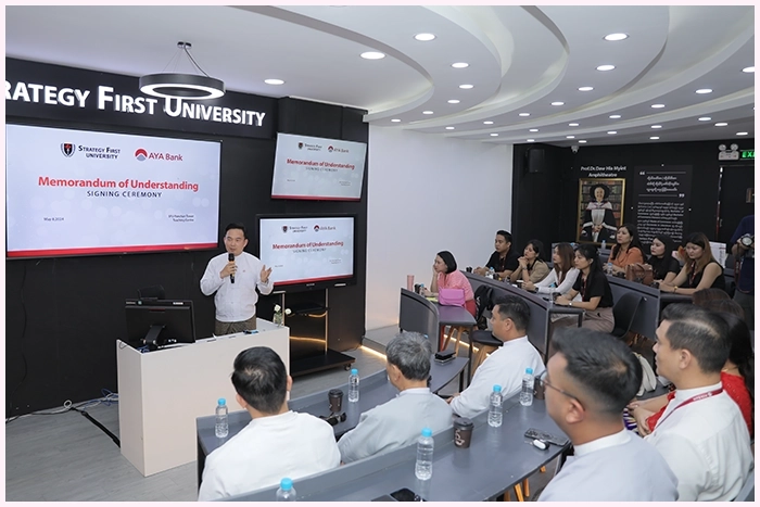 Strategy First International College မှ ကျောင်းသား၊ ကျောင်းသူများ အနာဂတ်ပညာရေးမှာ တစ်ဆင့်ပြီးတစ်ဆင့် အဆင်ပြေစွာတက်လှမ်းနိုင်ဖို့အတွက် Strategy First International College နဲ့ AYA Bank တို့ပူးပေါင်းပြီး AYA Education Loan ဝန်ဆောင်မှု သဘောတူစာချုပ်လက်မှတ်ရေးထိုးပွဲကို မေလ (၈) ရက်နေ့က Strategy First Panchan Tower Teaching Centre မှာ ပြုလုပ်ခဲ့ပါတယ်။ အဆိုပါပွဲမှာ Strategy First International College မှ Founder & President ဆရာ ဦးအောင်ချစ်ခင်၊ Vice President (Academic) ဆရာကြီး ပါမောက္ခ ဒေါက်တာ ဦးစိန်မင်း၊ ဆရာမကြီး ပါမောက္ခ ဒေါက်တာ ဒေါ်ဥမ္မာမြင့်၊ Director of Business Development ဒေါ်မေသက်နှင်း နဲ့ ဌာနအသီးသီးမှ အကြီးအကဲများ၊ AYA Bank မှ Chief Business Officer ဦးနေလင်းထွဋ် ၊ Director of Consumer Banking ဦးဇာနည်လင်း နဲ့ AYA bank မှ ဌာနအကြီးအကဲများ တာဝန်ရှိသူများ တက်ရောက်ခဲ့ကြပါတယ်။
