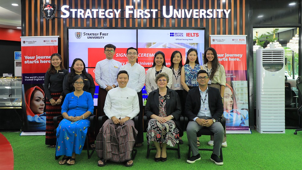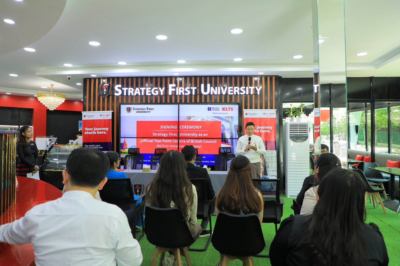 British Council မှ Strategy First International College (Mandalay Teaching Centre-2) ကို မန္တလေးတိုင်းဒေသကြီးရဲ့ တစ်ခုတည်းသော IELTS on Computer Testing Point အဖြစ် ဆောင်ရွက်ရန် သဘောတူစာချွန်လွှာကို စက်တင်ဘာလ (၂၅) ရက်နေ့က Strategy First Panchan Tower Teaching Centre မှာ လက်မှတ်ရေးထိုးခဲ့ကြပါတယ်။ အဆိုပါ လက်မှတ်ရေးထိုးပွဲကို Strategy First International College ရဲ့ Founder/President ဦးအောင်ချစ်ခင် နဲ့အဖွဲ့ဝင်များ တက်ရောက်ခဲ့ကြပြီး British Council မှလည်း Country Director Ms. Sarah Deverall နဲ့ တခြားတာဝန်ရှိသူများ အားလုံးတက်ရောက်ခဲ့ကြပါတယ်။ အဆိုပါပွဲမှာ Strategy First International College မှ မကြာမီ IELTS Training Centre အဖြစ်း ဖွင့်လှစ်သွားဖို့အတွက်လည်း အကြံပြုဆွေးနွေးခဲ့ကြပါတယ်။
