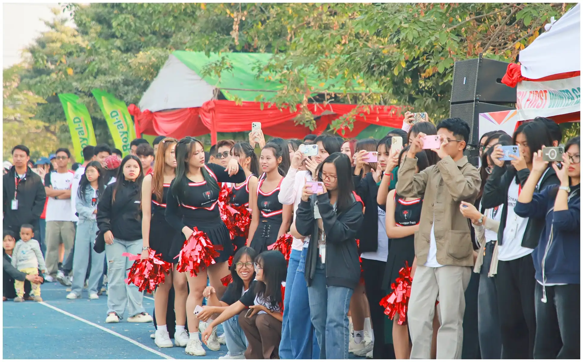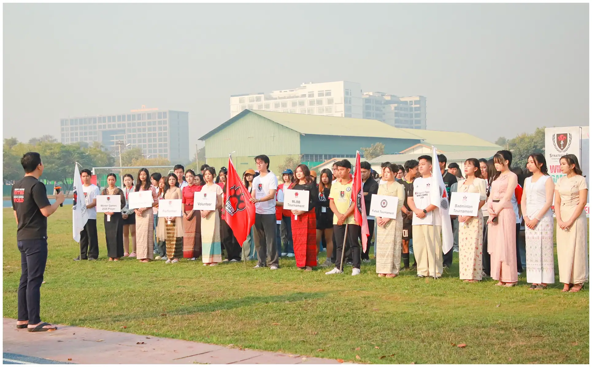Strategy First Winter Games 2026 ကို ကြည့်ရှုအားပေးဖို့ ရောက်ရှိလာကြတဲ့ ကျောင်းသား၊ ကျောင်းသူတွေ ပွဲကြည့်စင်မှာ နေရာယူပြီးနောက် ဖွင့်ပွဲအခမ်းအနားကို စတင်နိုင်ဖို့အတွက် ပြိုင်ပွဲဝင်ကျောင်းသား၊ ကျောင်းသူတွေ၊ သက်ဆိုင်ရာအသင်းတွေနဲ့ ပြိုင်ပွဲကိုယ်စားပြု ကျောင်းသား၊ ကျောင်းသူတွေနဲ့ Volunteers အဖွဲ့ဝင်ကျောင်းသား၊ ကျောင်းသူတွေက အခမ်းအနားကျင်းပမယ့် ကွင်းအတွင်းမှာ အစီအစဉ်တကျ နေရာယူခဲ့ကြပါတယ်။